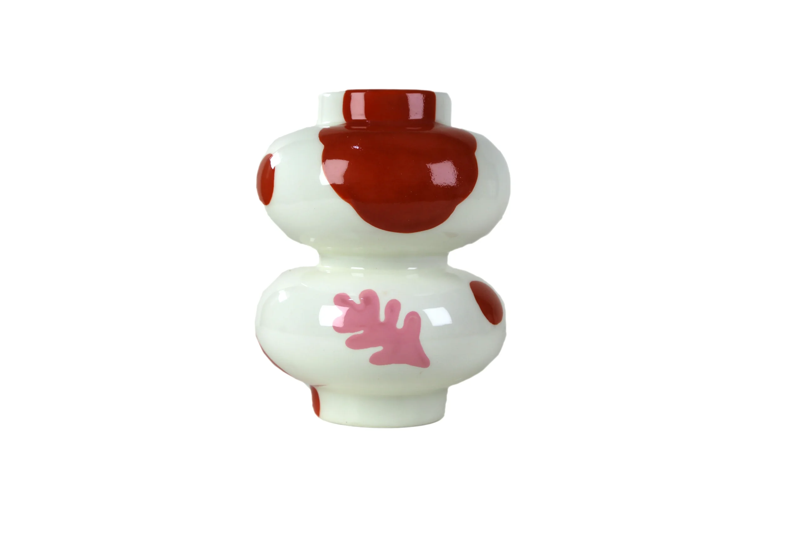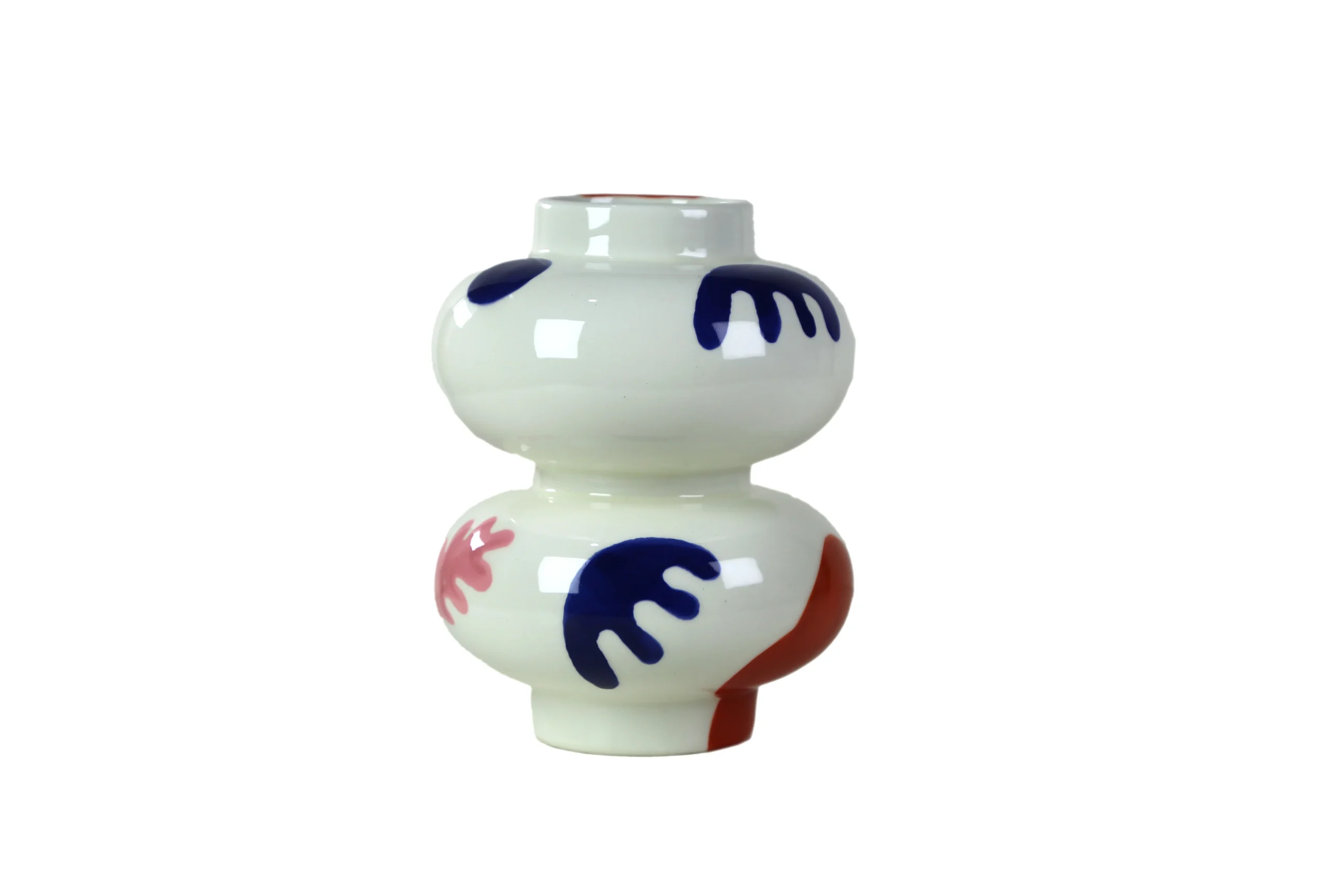 Meet Augustino – Autumn Leaves, a charming and artistic vase inspired by the soft, cozy colors of fall. Its double-bubble silhouette is hand-painted with playful leaf-like brushstrokes in deep navy, warm terracotta, and soft blush pink—creating a whimsical dance of color across the glossy white base.