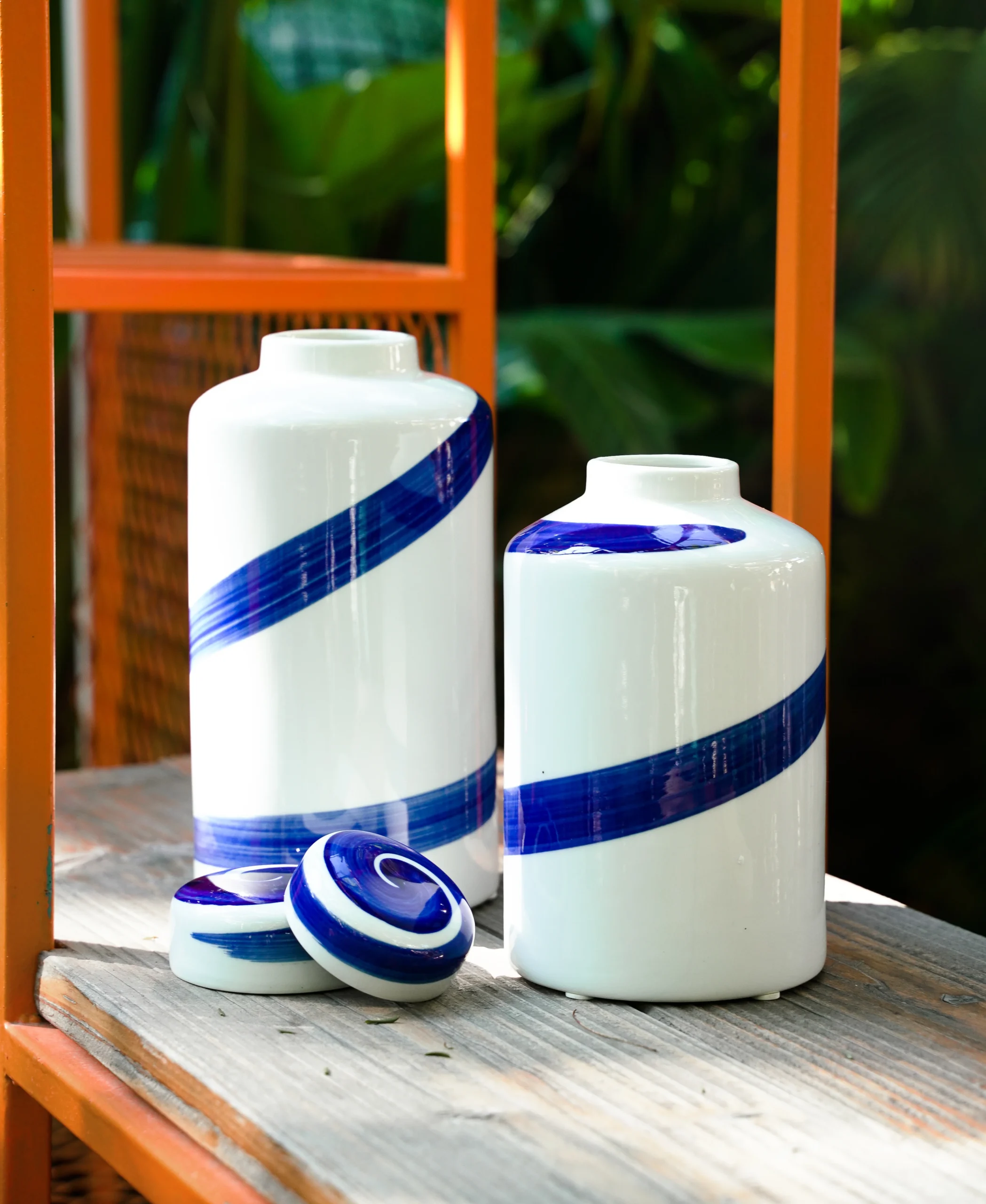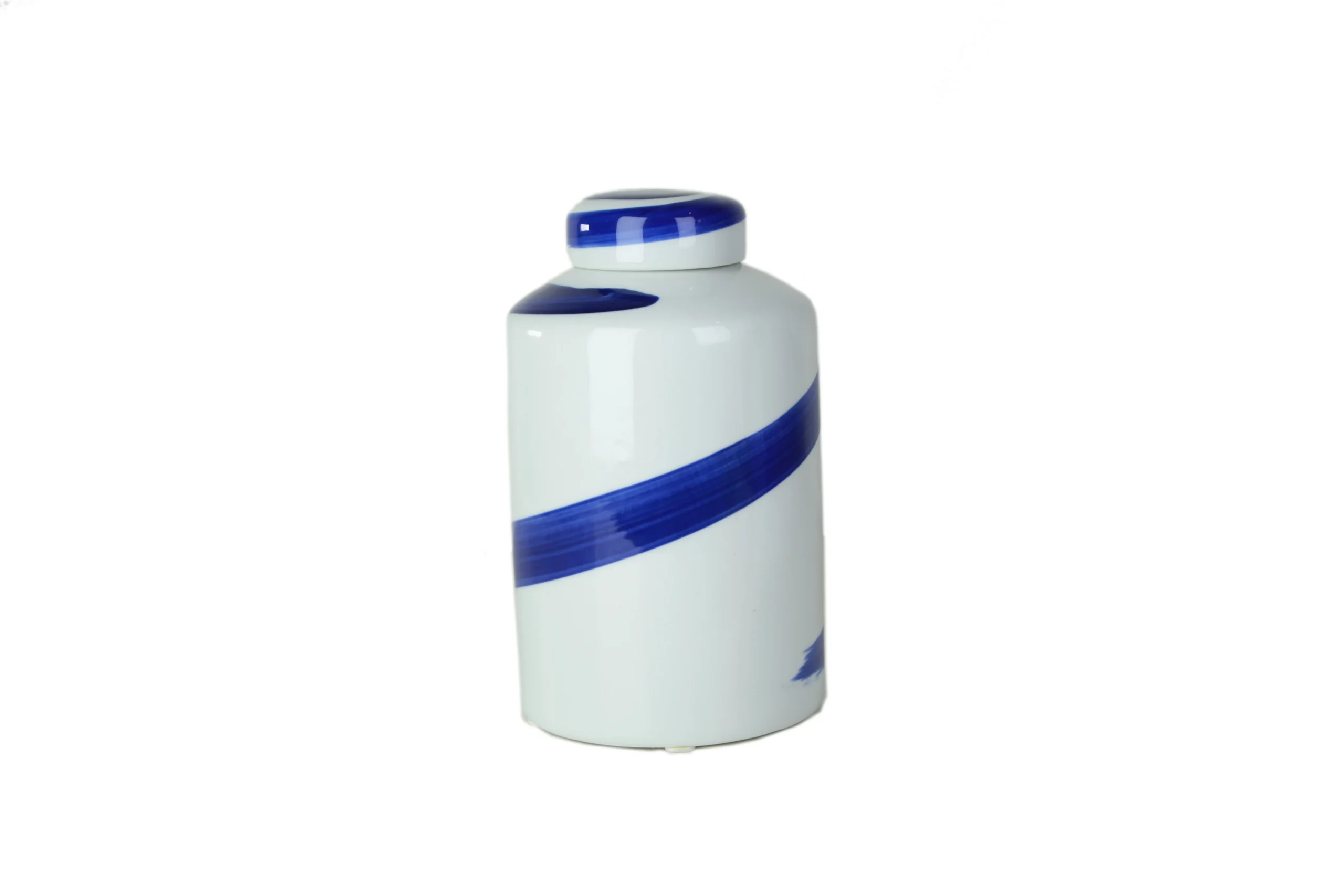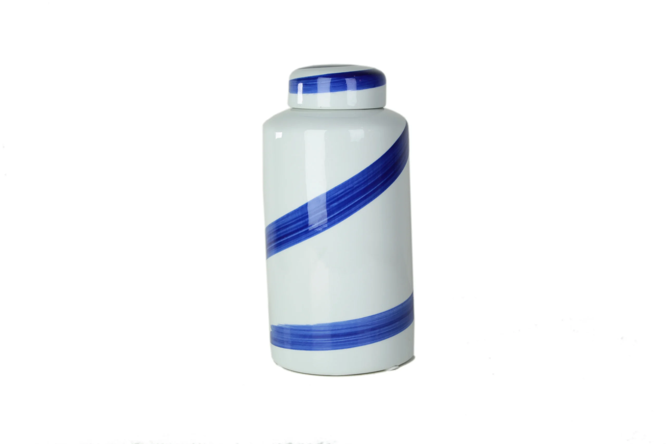 The Blue Ribbon Jar is a modern ceramic piece defined by its clean white surface and striking hand-painted blue ribbon swirl. Each jar features a fluid brushstroke that wraps gracefully around the body, creating a sense of movement and effortless elegance. The glossy finish enhances the rich cobalt tones, while the lidded design adds a refined, timeless touch.