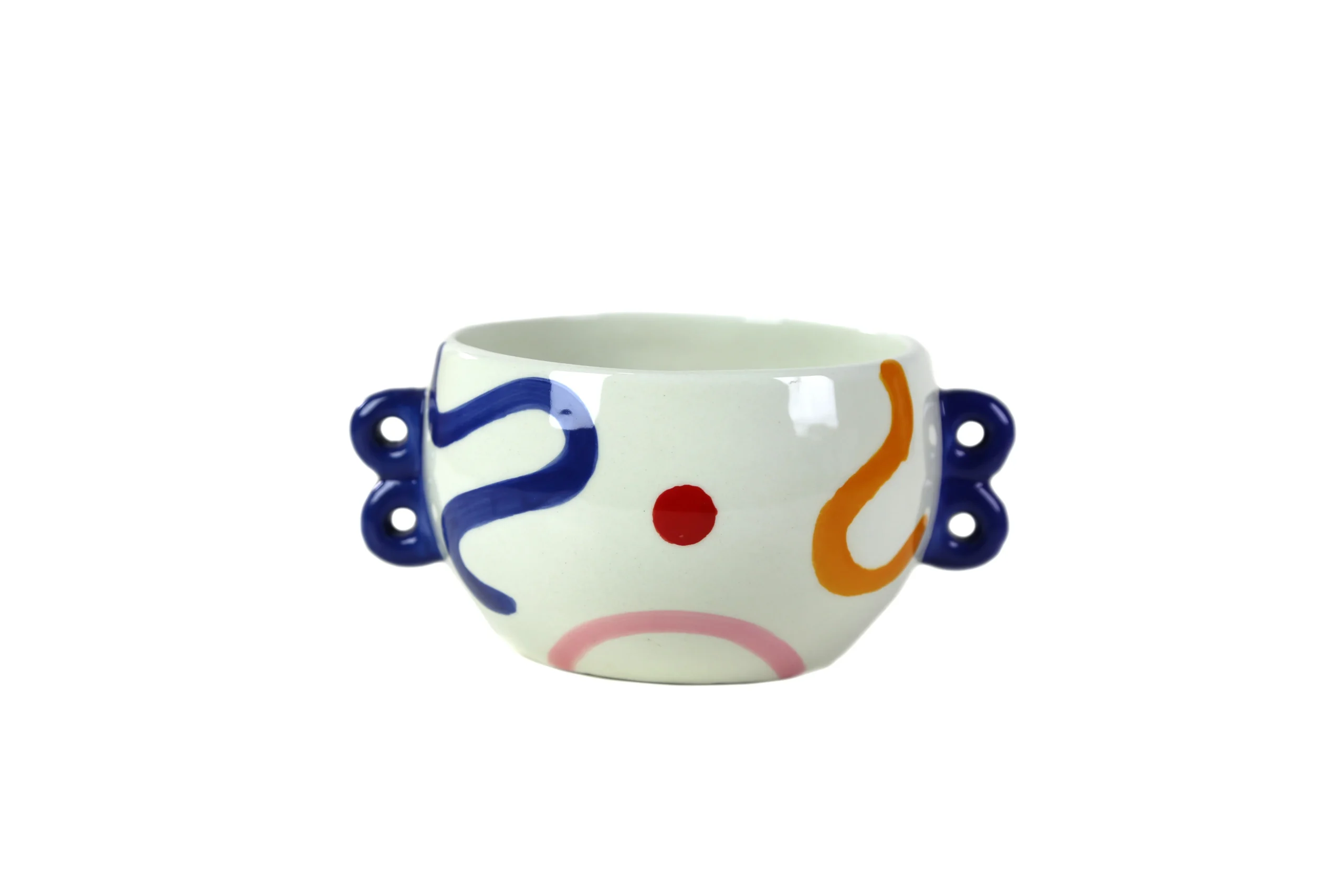 With glossy navy sculptural handles on each side, this bowl is both decorative and practical. Ideal for serving snacks, styling on open shelves, or adding a colorful accent to your coffee table or kitchen counter, Sofia is a charming piece that blends modern design with artistic personality.