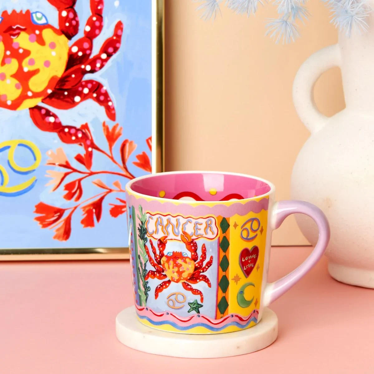 Sip your morning brew from a mug that expresses your Cancer zodiac sign! Hand-painted with a detailed crab illustration and vibrant rainbow colours, this mug is sure to bring a cheerful start to your day.
