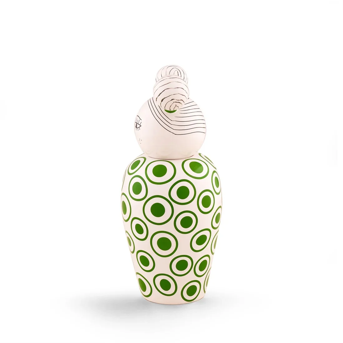 Her porcelain body is adorned with bold green circular motifs, creating a striking contrast against the soft ivory base. Whether displayed as a standalone art piece or paired with the full Canopie collection, Izumi adds a joyful touch to consoles, shelves, and design corners.