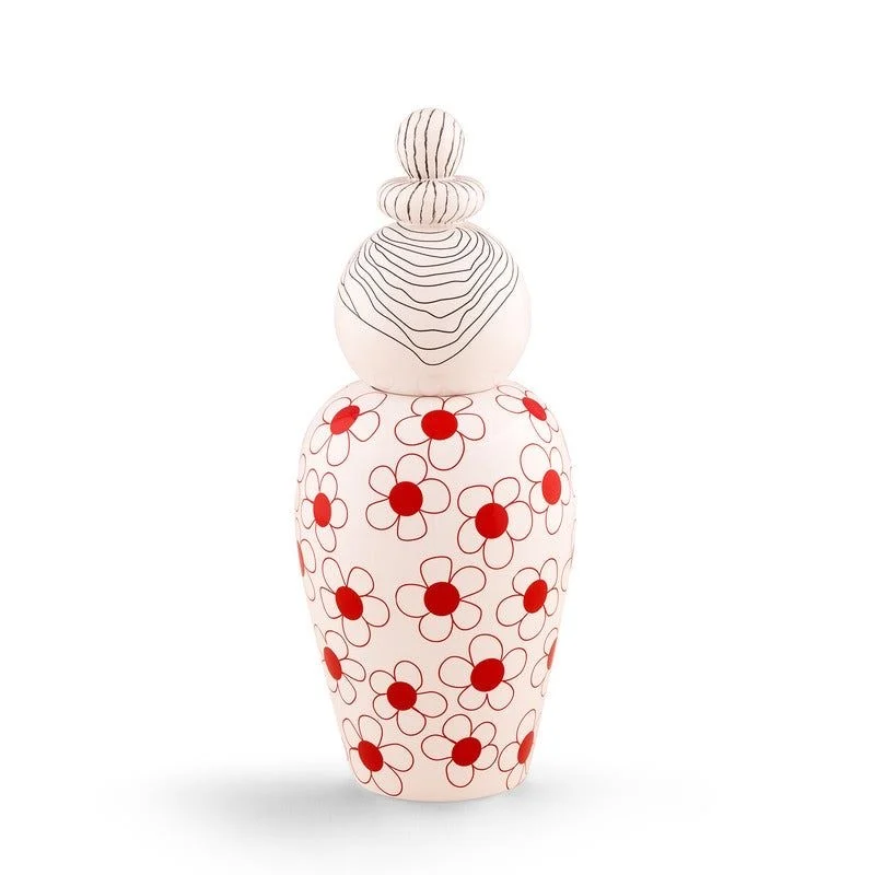 Her body is covered in a playful pattern of red-centered flowers outlined in soft lines, creating a vibrant yet balanced design. Whether displayed alone or as part of the collectible Canopie family, Pepa instantly becomes a conversation-starting decorative piece.