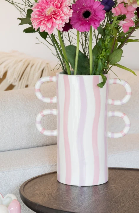 Elisa features six sculptural loop handles—three on each side—decorated with matching pastel stripe details. This unique silhouette adds character, making the vase a standout piece whether styled with fresh flowers, dried stems, or displayed as a decorative art object.