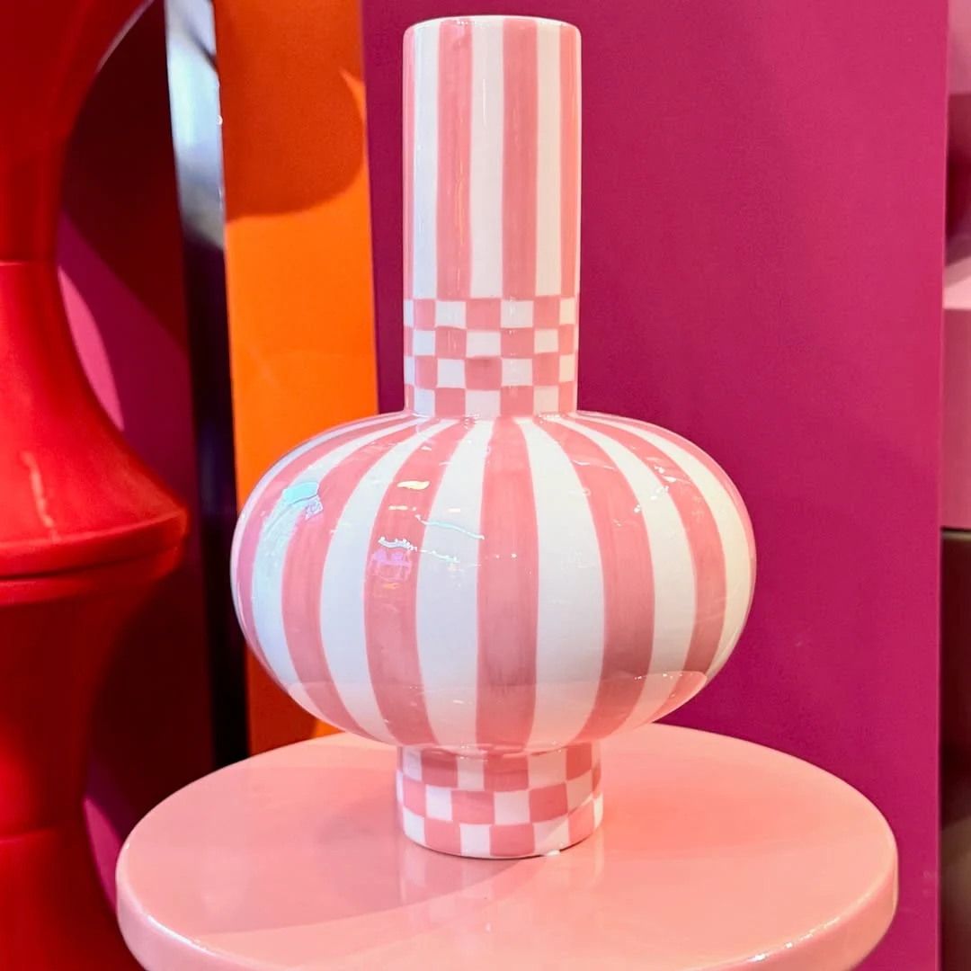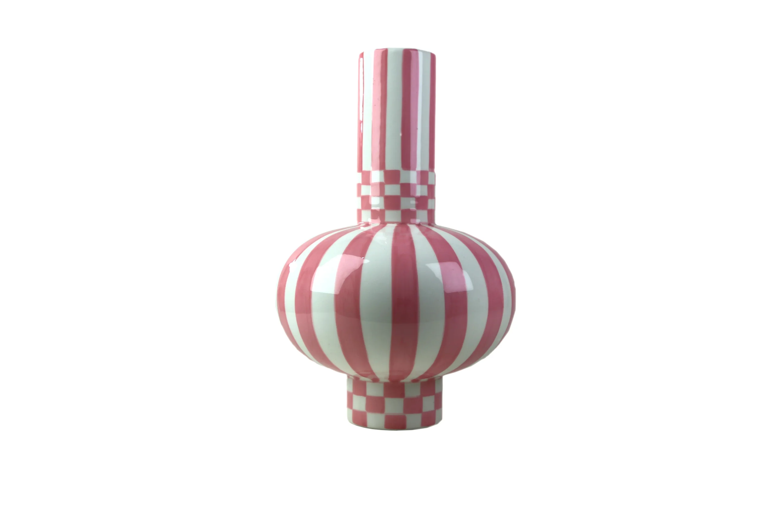 With its striking mix of vertical candy-pink stripes and a charming checkerboard pattern, Gabriel brings a fun graphic twist to any room. The tall, sleek neck contrasts beautifully with the rounded globe base, creating a silhouette that feels both modern and delightfully quirky.