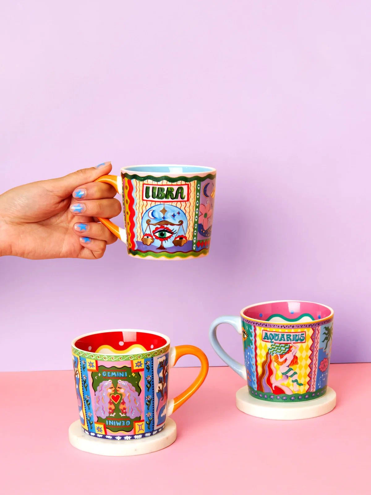Embrace your inner astrology vibe with this stunning Gemini Zodiac Mug. This mug is the perfect gift or new addition to your Eleanor Bowmer mug collection, featuring a cute hand-painted design and a vibrant orange handle. We have a mug for every Zodiac sign!