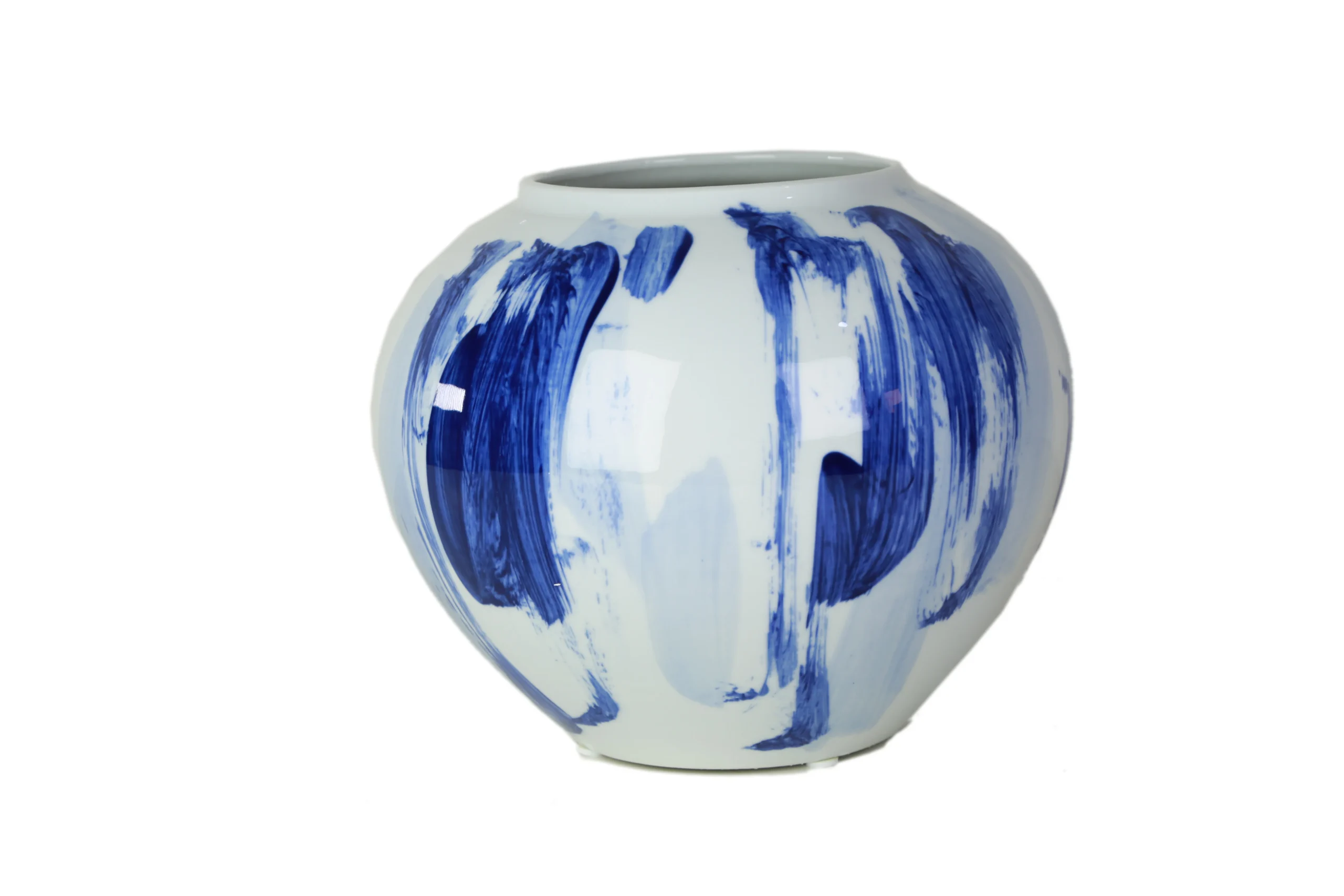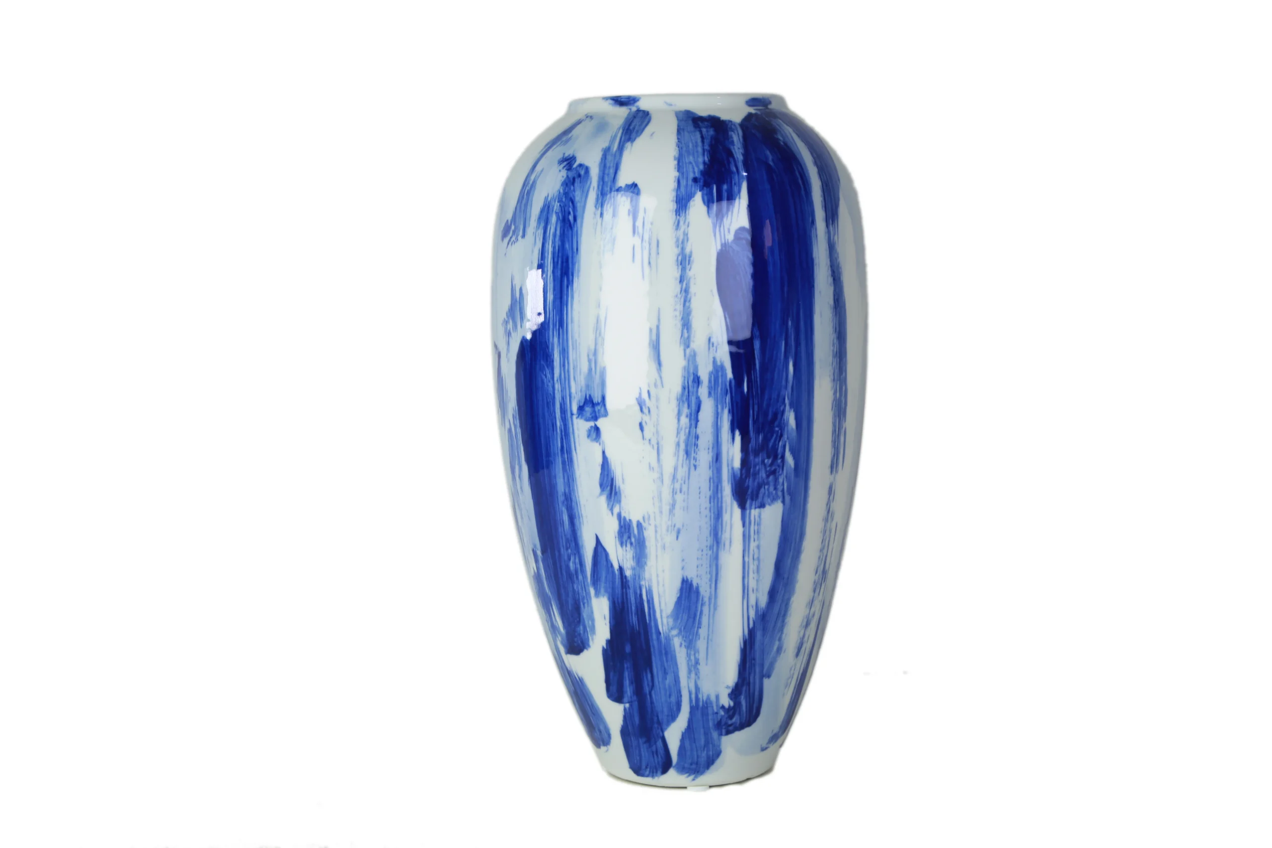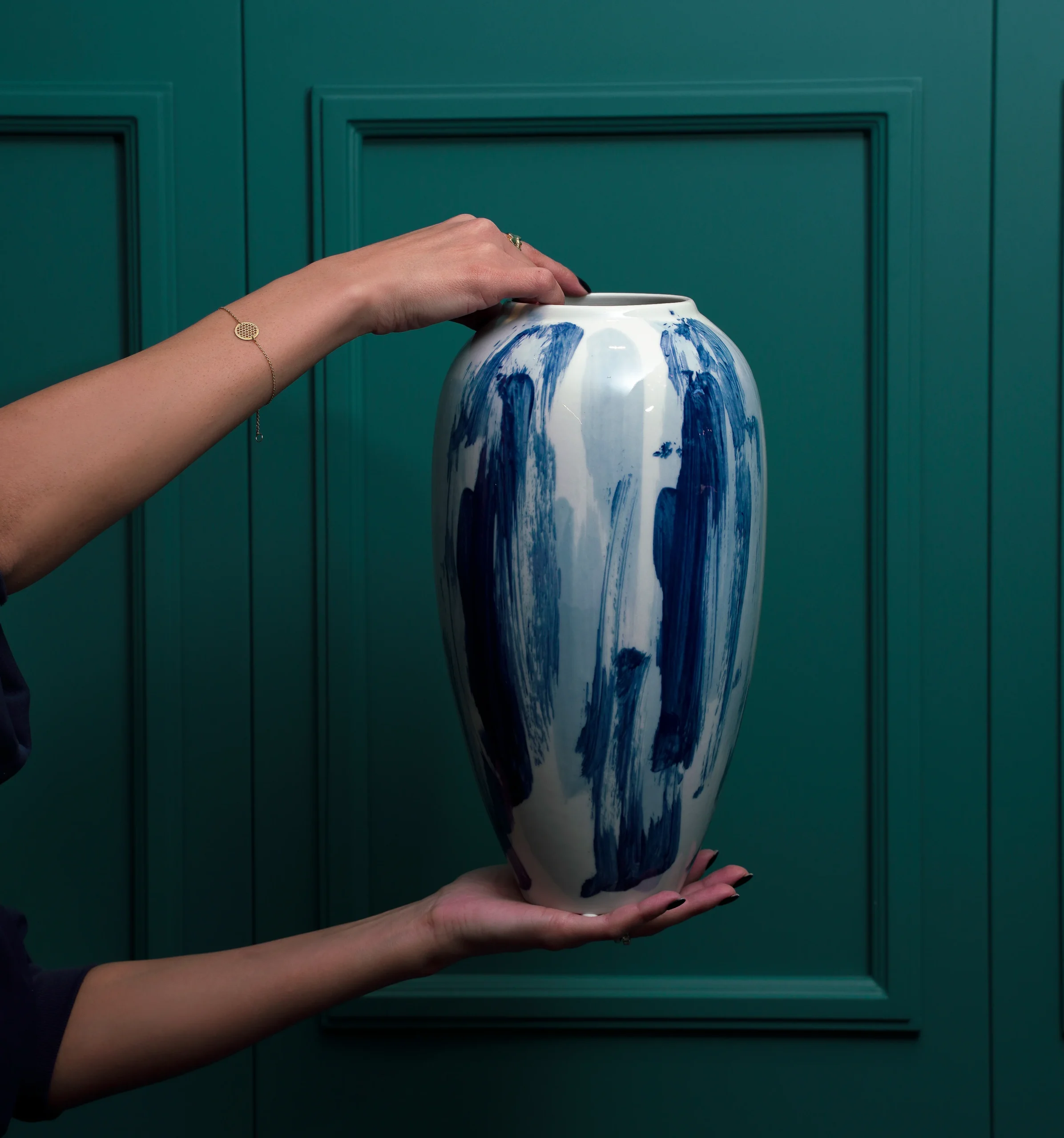 The Indigo Brushstroke Vase brings the beauty of hand-painted artistry into your home. Each piece features expressive deep-blue brushstrokes sweeping across a glossy white ceramic body, creating a modern yet timeless look inspired by traditional Mediterranean craft.