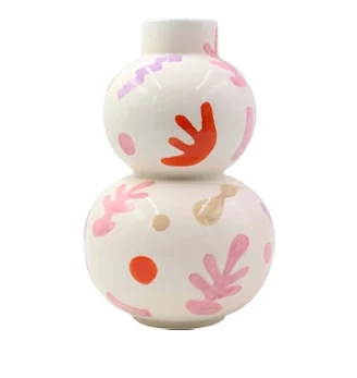 The glossy white base becomes a canvas for dancing pink leaves, bold orange accents, soft blush dots, and deep purple zigzags — each stroke adding charm and artistic character. Its rounded body makes it perfect for short stems, dried florals, or simply standing alone as a sculptural statement.