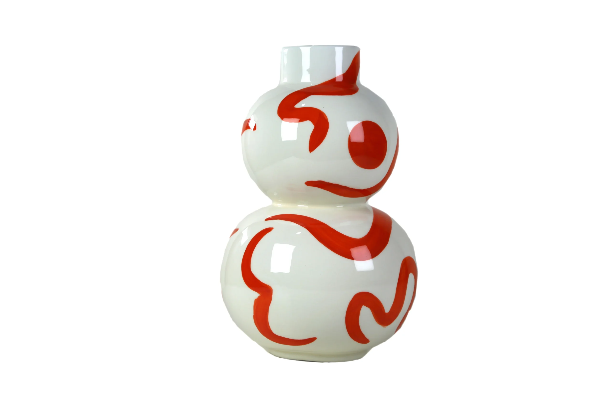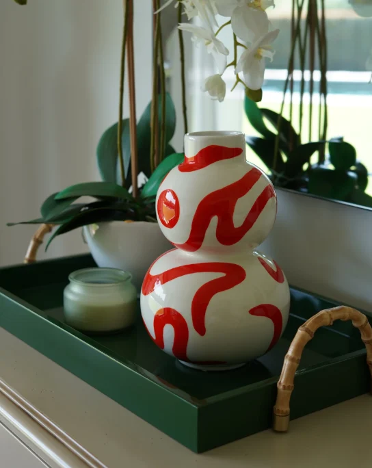 Introducing Isla – Sol Y Sombra, a bold and expressive vase that brings movement, warmth, and artistic flair into any home. Hand-painted with flowing red brushstrokes and circular accents over a glossy white base, this piece beautifully captures the contrast of sun and shadow—vibrant, dynamic, and full of character.