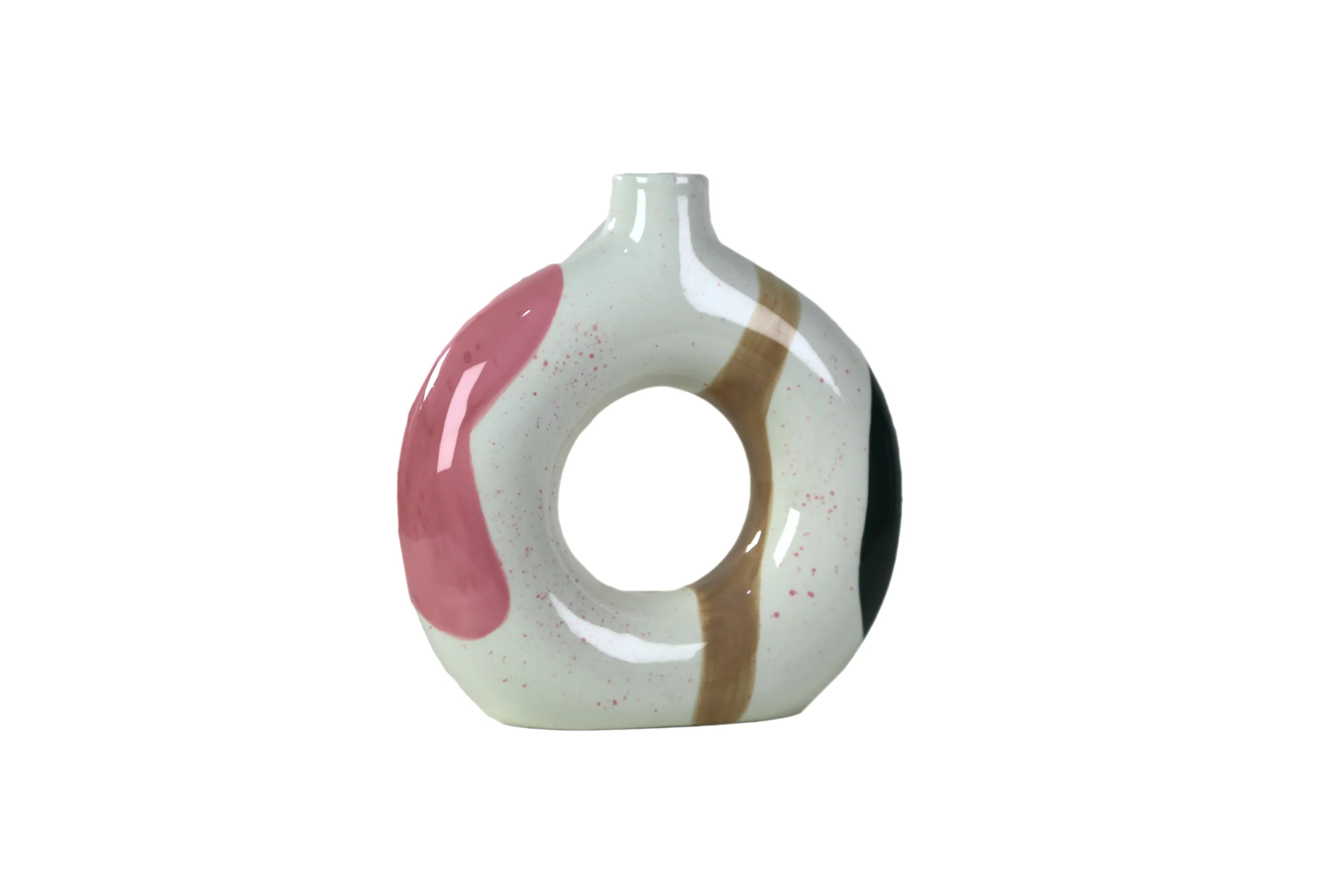 Meet Josefina – La Guapa, a sculptural beauty that brings modern artistry and warm elegance into your home. With its iconic donut-shaped silhouette and bold hand-painted strokes in blush pink, earthy caramel, deep green, and soft speckled ivory, Josefina effortlessly stands out as a statement piece.
