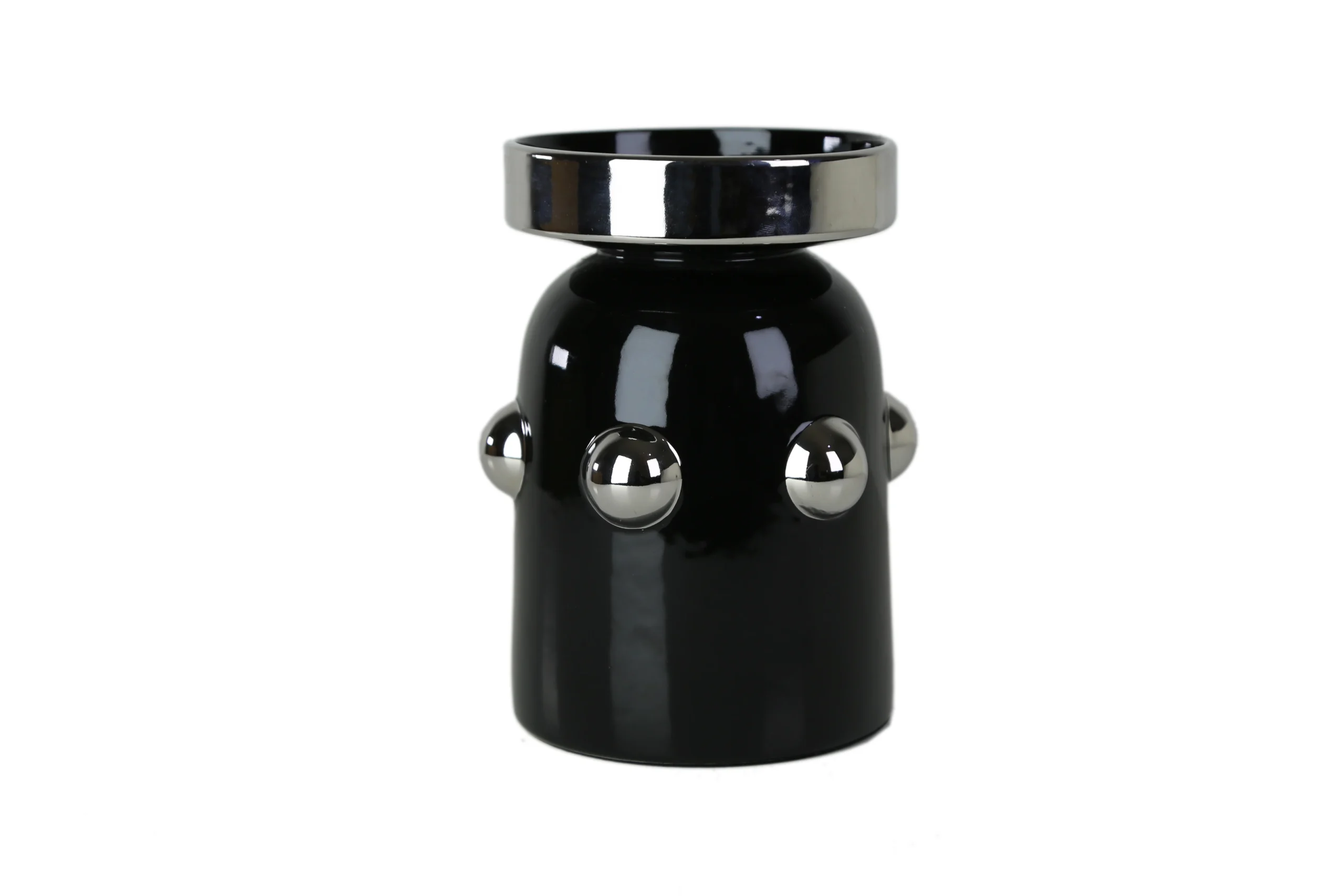 The cylindrical form is clean and minimal, but the metallic dome-shaped studs add dimension, texture, and a striking reflective shine. The wide chrome-rimmed top gives it a luxurious, architectural feel — making it a standout piece.