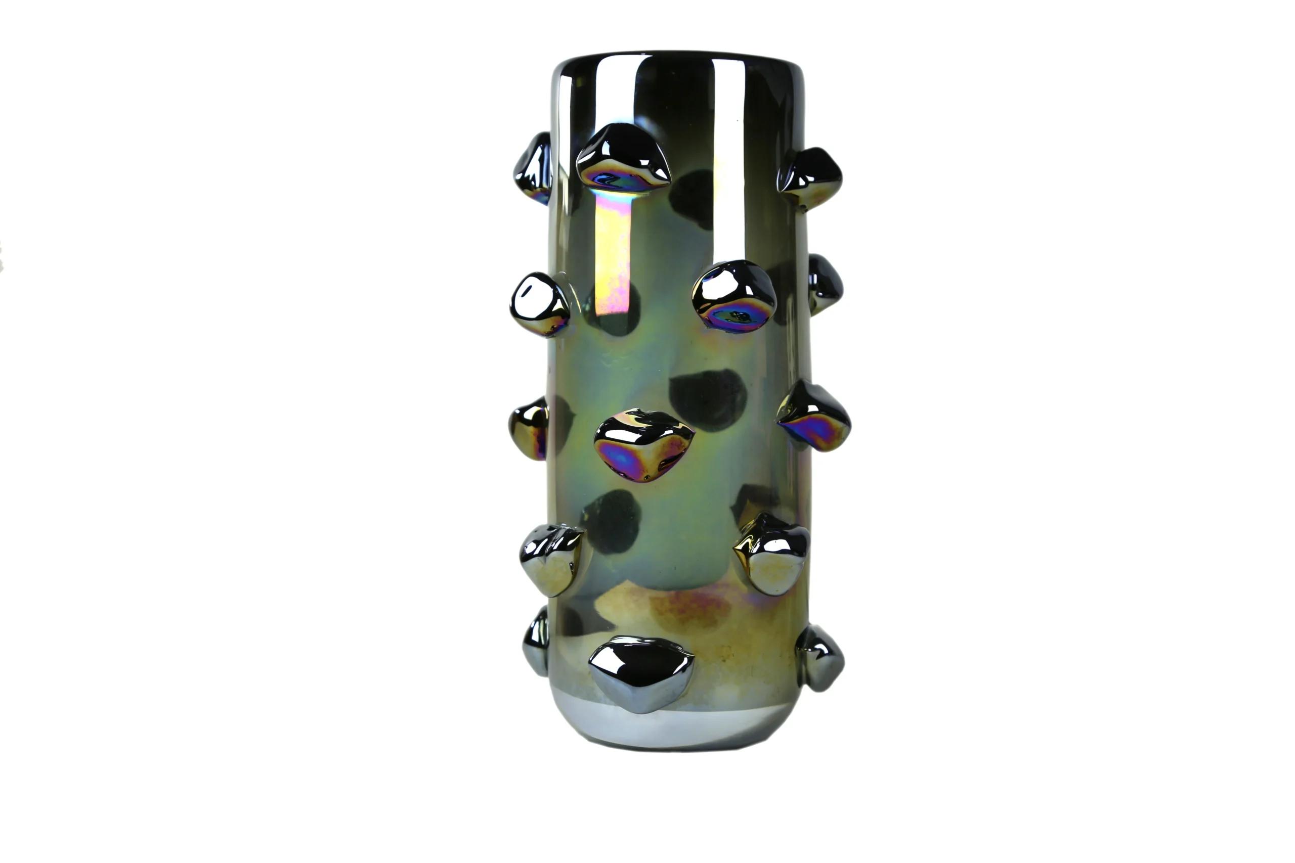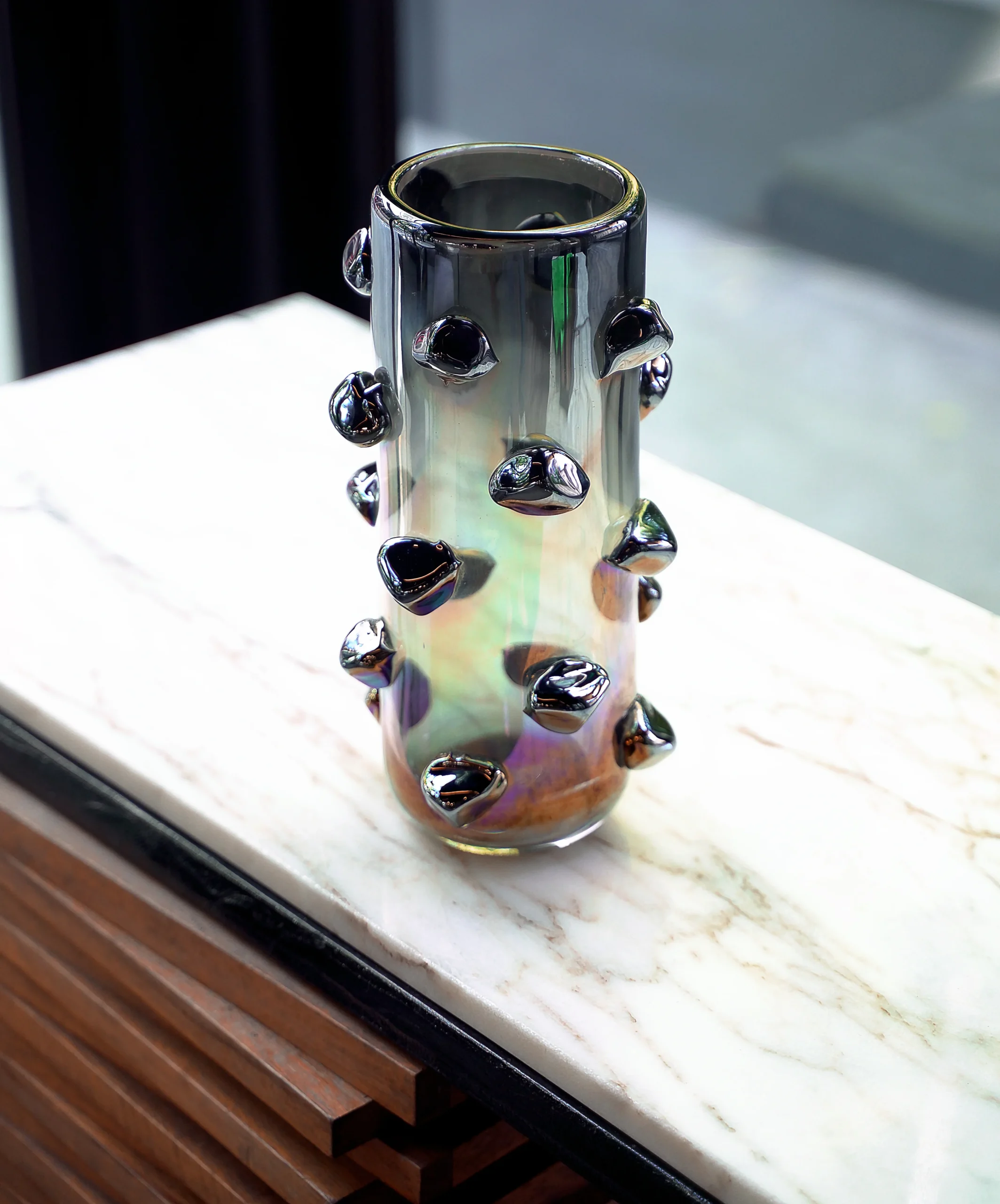 Say hello to the Orion Vase – Midnight Meteors, a striking centerpiece that looks as if it was crafted from the cosmos itself. With its glossy, iridescent surface and dramatic metallic stone-like studs, this vase brings a futuristic, sculptural edge to any space.