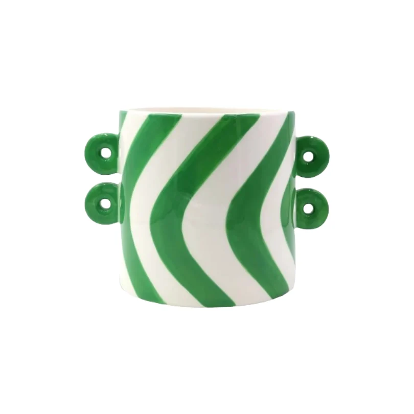 Bring vibrant character to your space with the Plant Pot Felipe, a striking ceramic piece designed to stand out. Featuring bold green wavy stripes over a crisp white background, this pot instantly adds movement and freshness to any room. Its signature round side dots give it a playful sculptural look while offering a unique design twist.