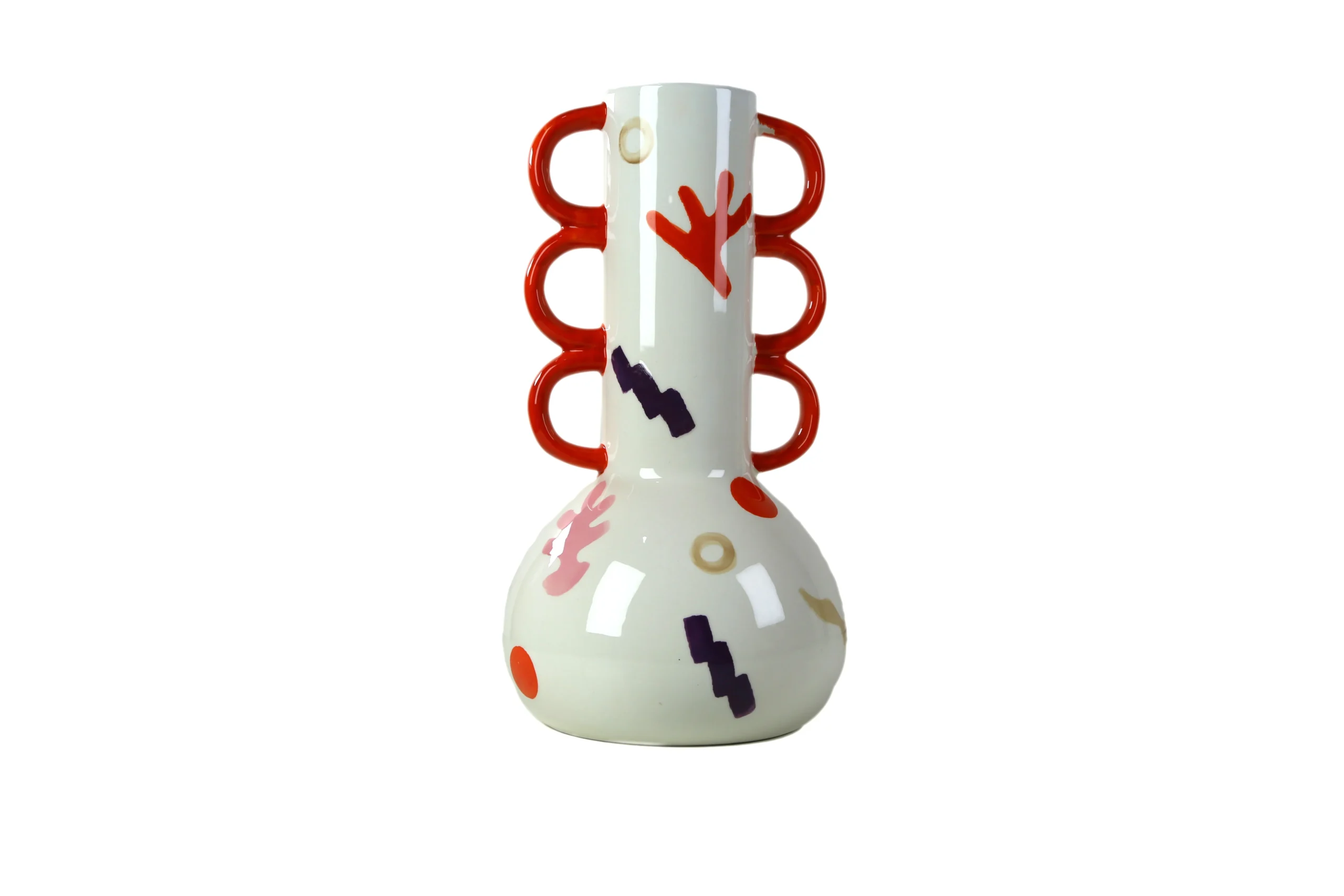 Hand-painted doodles in pink, purple, orange, beige, and red dance across the smooth glossy surface, giving Tomás a lively abstract charm. The bulbous base adds softness and balance, making it perfect for both statement styling and floral displays.